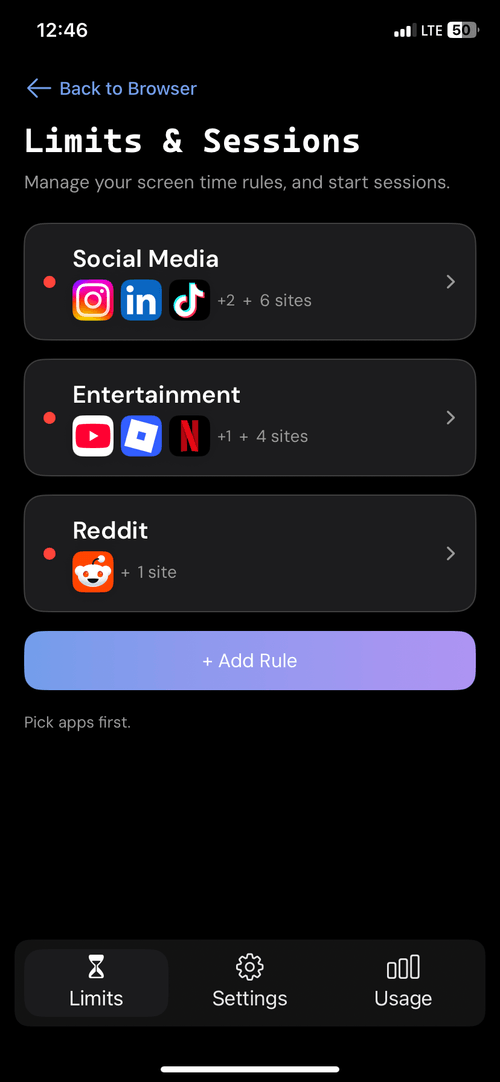 Unlike other apps, Reelockr helps you set a usage goal before every time you open a distracting app or website.